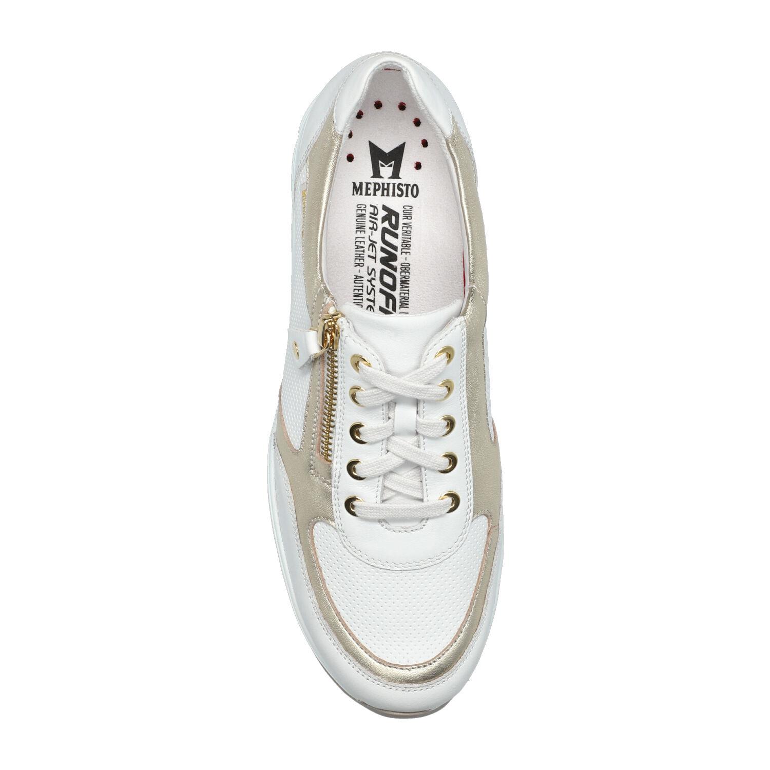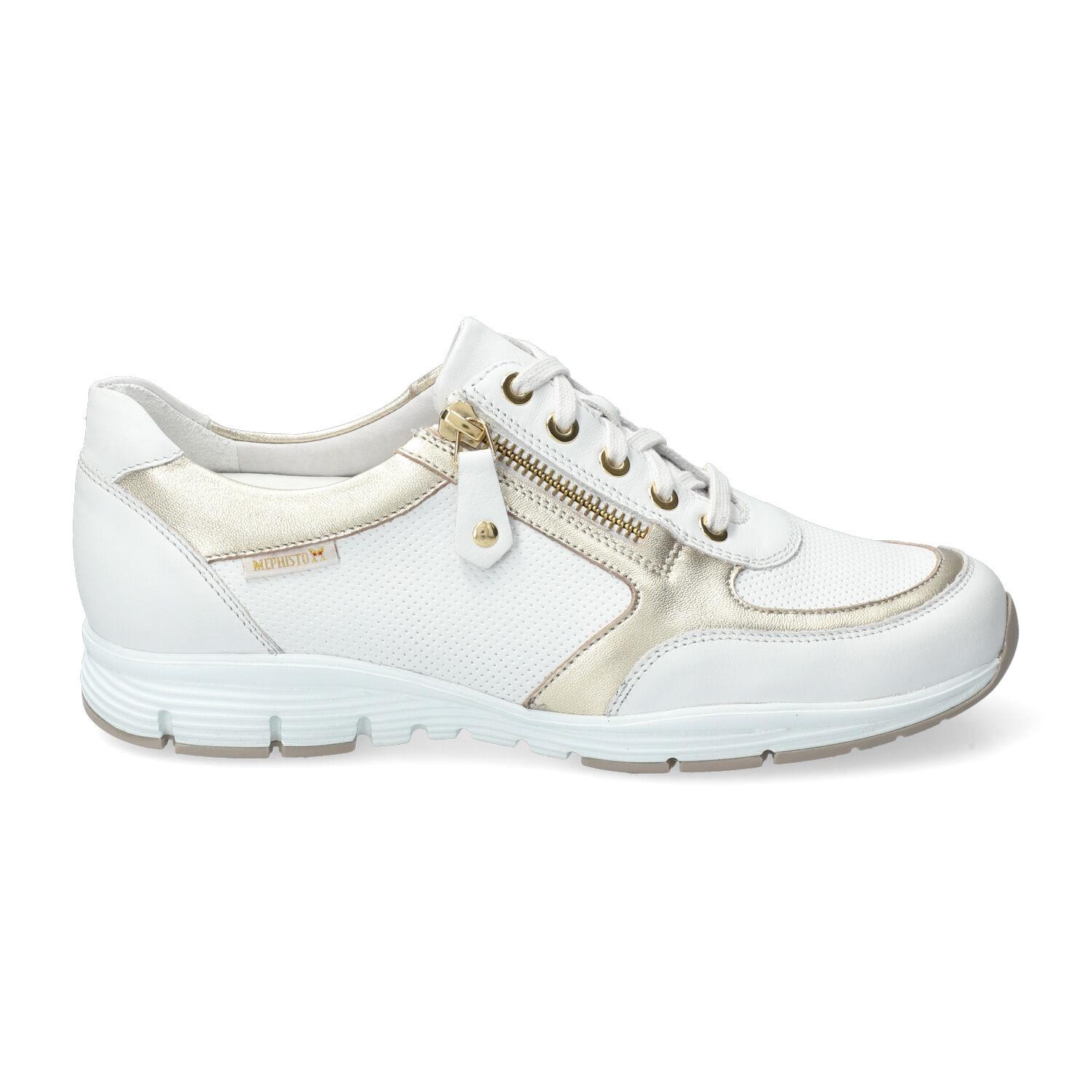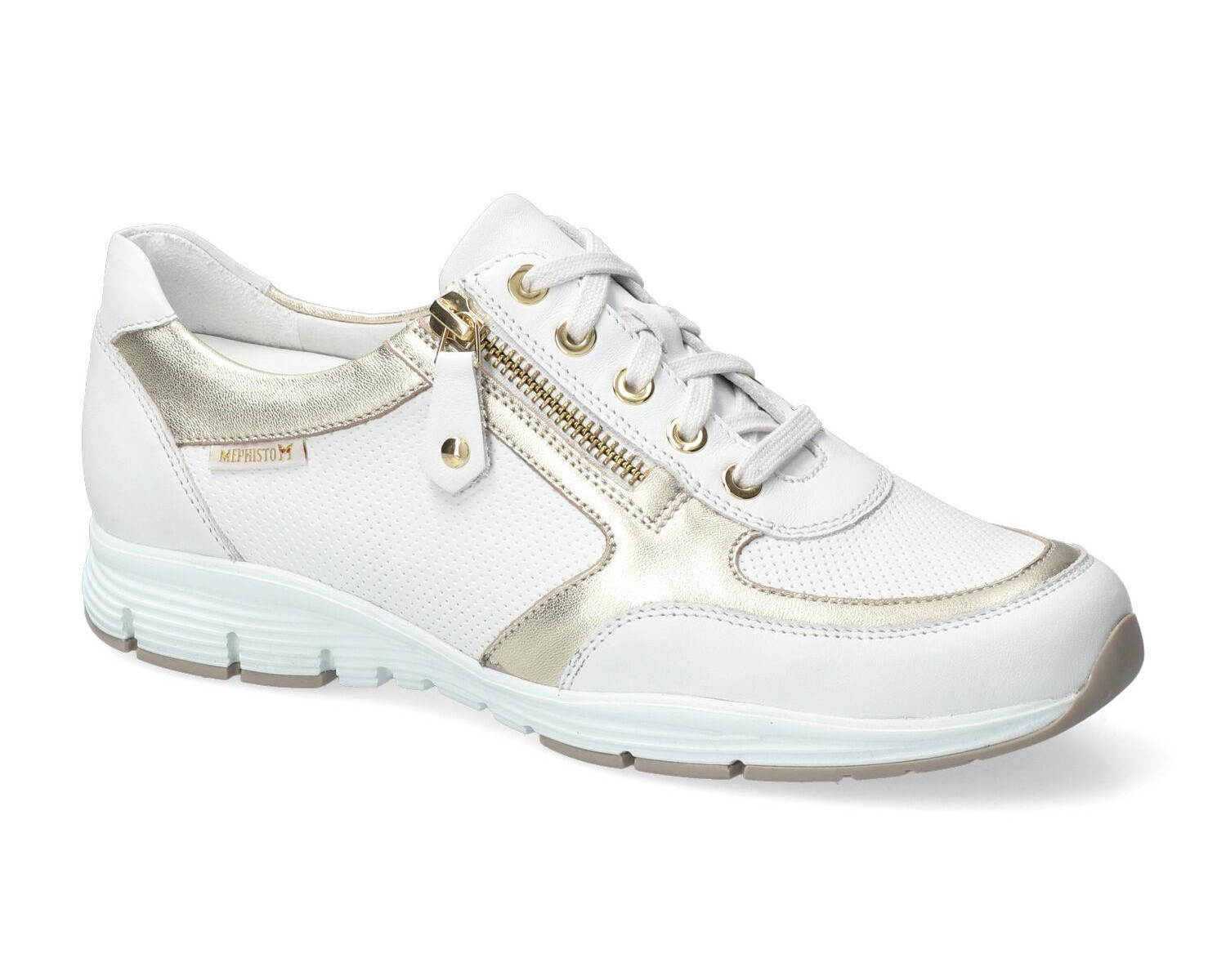 Découvrez la basket femme Mephisto alliant élégance et confort. Ce modèle sophistiqué présente une tige en cuir blanc de qualité supérieure, agrémentée de détails dorés métalliques brillants qui lui confèrent une touche de luxe. La combinaison astucieuse de lacets et d'une fermeture éclair latérale dorée assure un chaussage rapide et un ajustement parfait. Idéale pour un look chic et décontracté, sa semelle amortissante SOFT-AIR offre un bien-être exceptionnel à chaque pas. Parfaite pour la marche ou le quotidien, cette chaussure Mephisto est le choix idéal pour celles qui ne veulent pas compromettre le style pour le confort.
