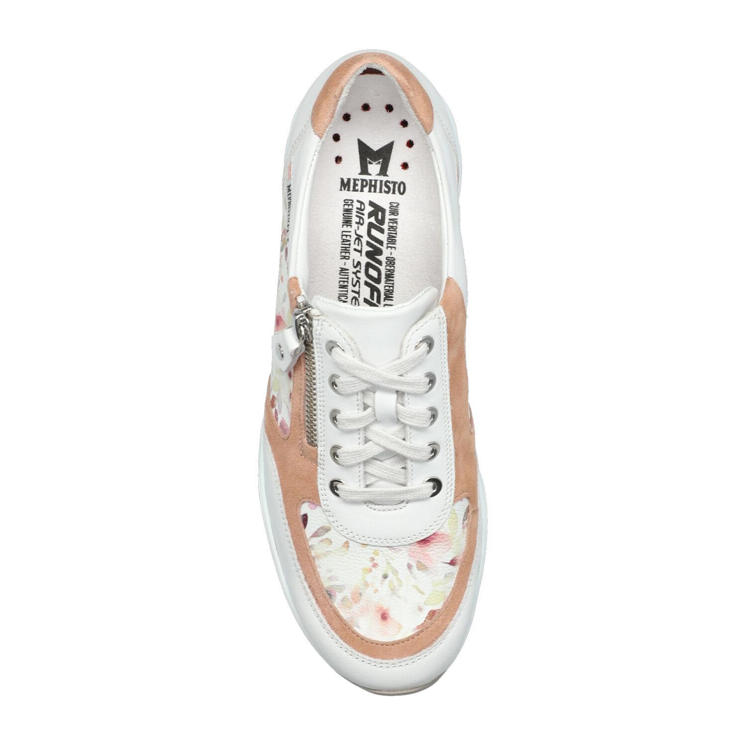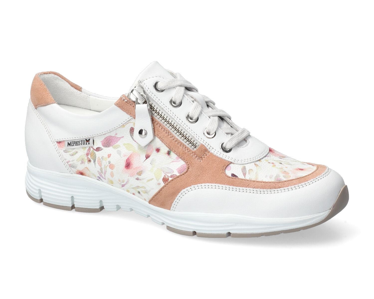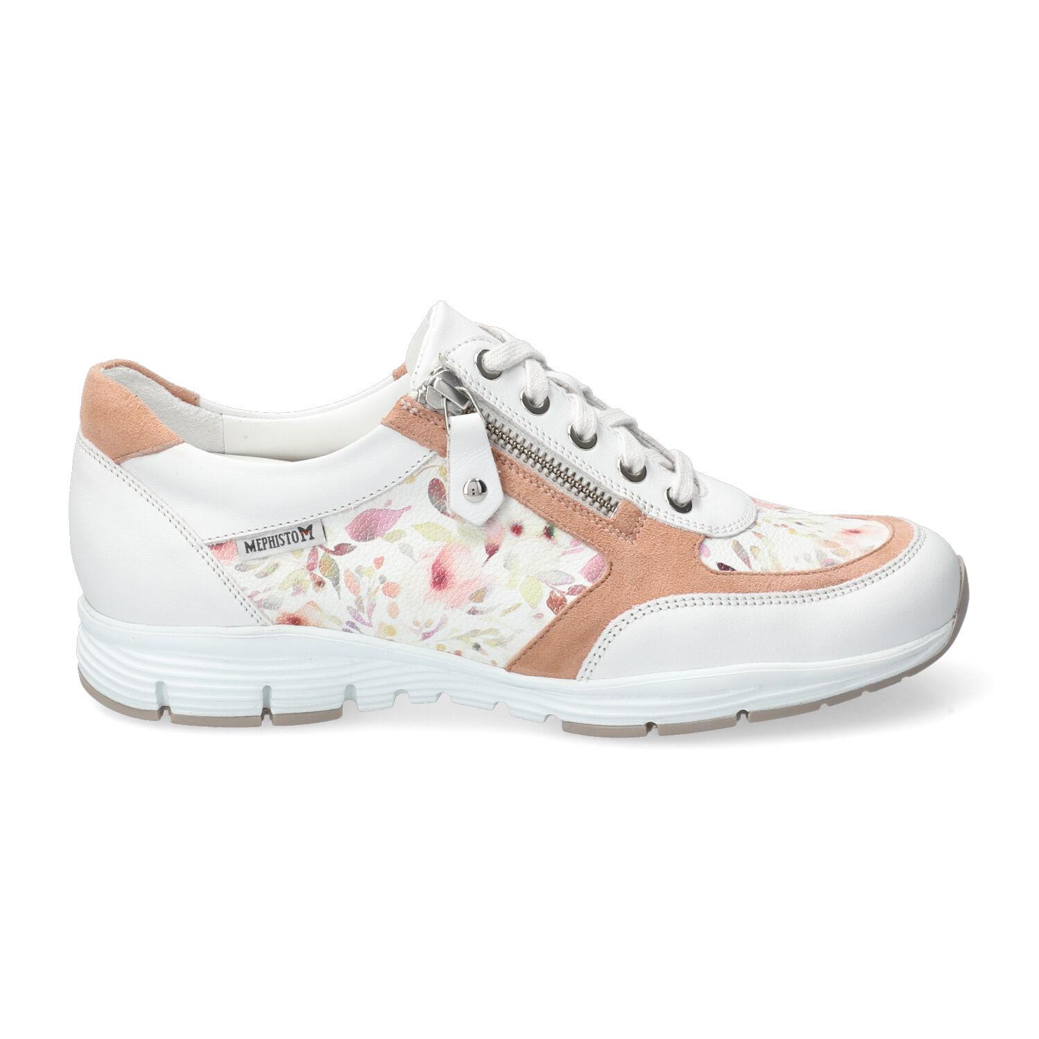 Découvrez les sneakers Mephisto pour femme, l'alliance parfaite du confort et de l'élégance. Ce modèle arbore un cuir blanc immaculé, rehaussé d'empiècements fleuris pastel délicats et de détails en daim rose poudré subtils. La fermeture éclair latérale pratique, associée aux lacets, assure un chaussant facile et un maintien optimal. Profitez d'une semelle amortissante avancée qui garantit un bien-être inégalé à chaque pas. Idéales pour un look printanier chic et décontracté, ces chaussures mode sont conçues pour les femmes actives recherchant style et performance au quotidien. Optez pour le design floral unique qui apportera une touche de fraîcheur à toutes vos tenues.