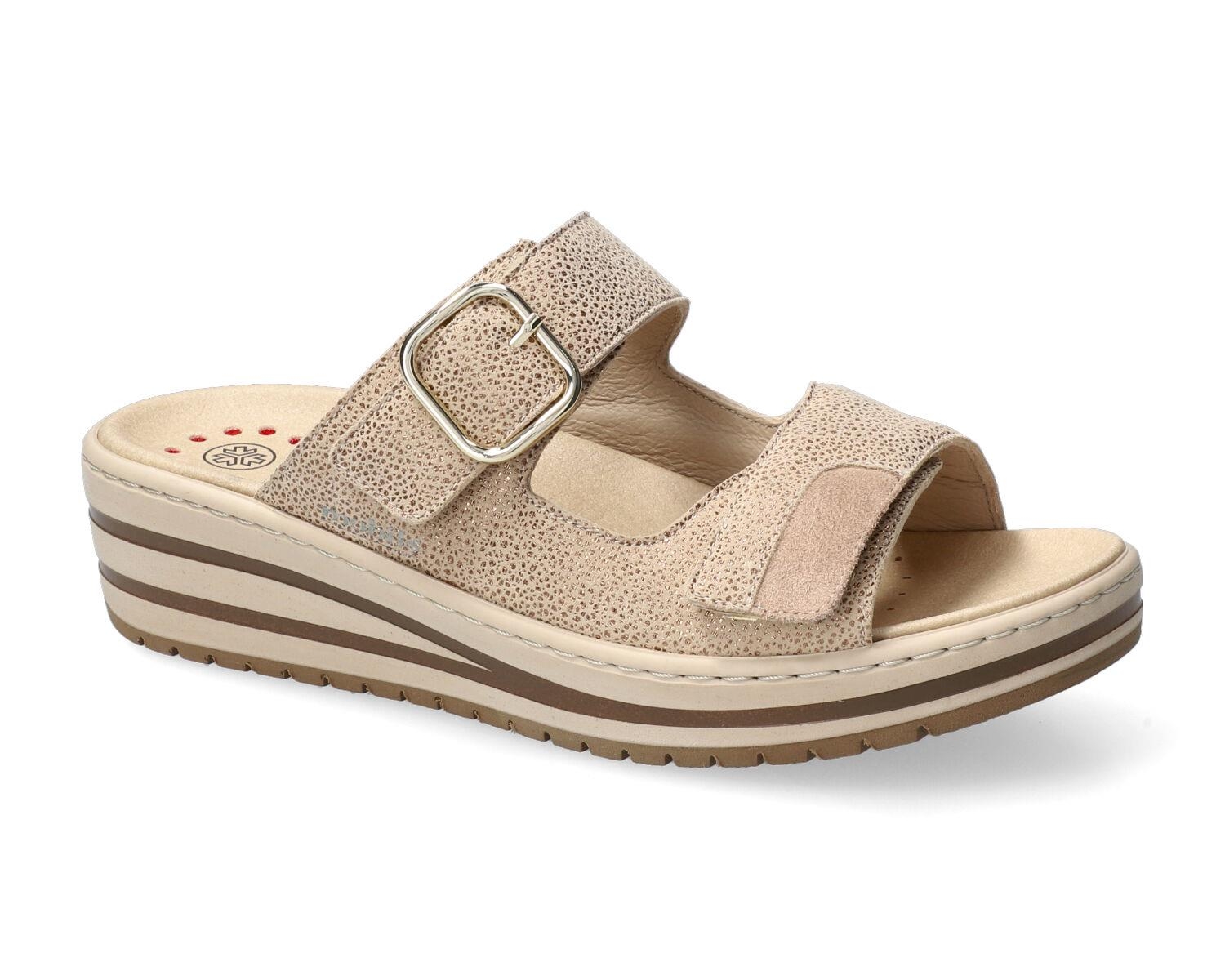 Découvrez nos élégantes mules compensées beiges, l'alliance parfaite entre confort orthopédique et style raffiné. Conçues pour vos journées actives ou vos soirées décontractées, ces sandales arborent une tige en cuir texturé d'une teinte champagne délicate, sublimée par une boucle décorative dorée sur la bride supérieure. Le double système de réglage à Velcro, dissimulé sous la boucle et sur la bride avant, assure un ajustement parfait et un maintien optimal pour chaque pied, garantissant un confort sur mesure. La semelle compensée légère offre une hauteur agréable sans compromettre la stabilité, tandis que la semelle intérieure matelassée et anatomique prend soin de vos pieds pas après pas. Idéales pour une marche prolongée, elles sont le choix parfait pour allier bien-être et élégance estivale.