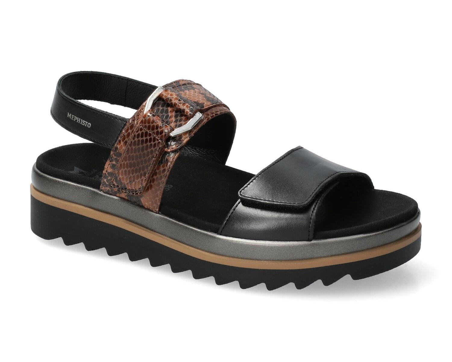Optez pour l'excellence avec la sandale compensée Mephisto, l'alliance parfaite du confort et du style tendance. Conçue en cuir véritable de qualité supérieure, cette sandale plateforme se distingue par son design audacieux et ses finitions soignées. Elle présente une sangle arrière ajustable pour un maintien optimal, une sangle avant large à fermeture velcro garantissant un ajustement personnalisé, et une sangle intermédiaire à motif serpent avec boucle décorative, apportant une touche chic et sauvage. La semelle crantée épaisse assure une adhérence irréprochable et un amorti exceptionnel, transformant chaque pas en un moment de pur bien-être. Idéale pour sublimer vos tenues estivales avec élégance et originalité.